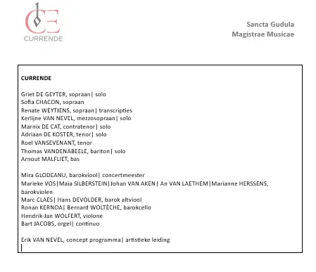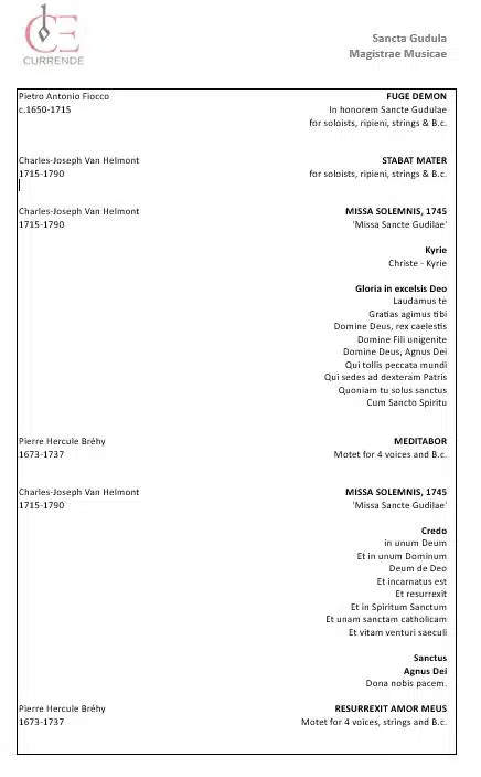 L’héritage musical de notre cathédrale est d’une grande richesse. Erik Van Nevel, qui en est l’un des plus fins connaisseurs, a choisi de l’illustrer en interprétant à la tête de l’ensemble Currende la Missa Sanctae Gudilae composée en 1745 par Charles-Joseph van Helmont (1715-1790), qui exerça de 1741 à 1777 la fonction de maître de chapelle de la collégiale. Avec ses sublimes Leçons de Ténèbres (1737), la Missa Sanctae Gudilae assure aujourd’hui à ce maître fort apprécié de son temps une place méritée dans le panthéon des compositeurs baroques.